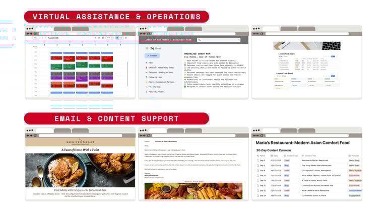 I assist with structuring files and documents, optimizing inboxes and calendars, and providing ongoing operational support as businesses grow and evolve.